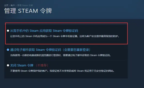 3、进入管理steam令牌界面,勾选从我手机中的steam应用获得令牌认证码。