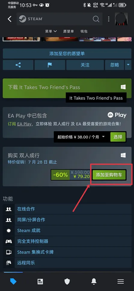 2、找到喜欢的游戏后,将该游戏详情界面向下滑动,并点击添加至购物车