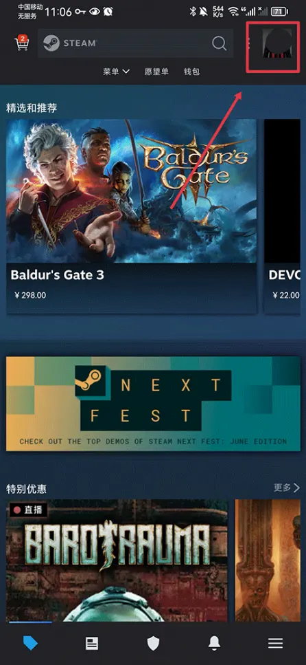 1、打开手机Steam国际版客户端后,在首页中你可以直接在搜索框中输入游戏名称,也可以根据新品、优惠、免费游戏、按用户标签等类别进行查询