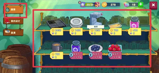 7、若玩家觉得制作食物太慢时,可以在商城中的厨房内购买需要的物品,更好的电器设备意味着有更快的食物和更快乐的顾客哦