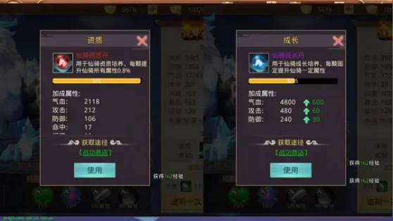 在系统模块达到3阶之后,可使用对应的“成长丹”,每颗“成长丹”可为人物角色增加攻击、防御、气血属性。系统模块达到4阶之后,可使用对应“资质丹”,每颗“资质丹”可以提升对应模块所有属性0.8%。模块的阶数越高,可使用的成长丹和资质丹越多,同样每颗成长丹和资质丹增加的属性越多。