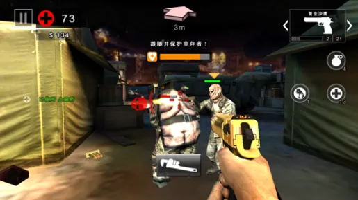 3、射击操作和武器切换:游戏新手推荐是自动攻击功能,近战攻击的话利用近战武器可以直接敲死僵尸(在游戏中间下方有个切换按钮,点击就能自动切换),远程的话只要僵尸进入射程瞄准器瞄准僵尸就能自动攻击。(自动射击可以设置切换到手动按键射击)