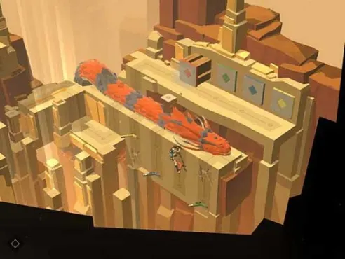 场景三的挑战依然在等待着我们,劳拉来到第一个小平台上时巨蟒就会发动攻击,我们需要向下方躲避一下登上最上方的高台处。爬上高台的一瞬间会吸引蜥蜴的仇恨,我们带着蜥蜴兜个小圈子并将立柱向外拖动一格。此时蜥蜴因为立柱的阻挡而失去尾随目标,我们可以趁机击杀掉它。接着我们将立柱推到下方空缺着的路口处,搭建一个临时的行进平台。跳下高台后再躲避巨蟒的一次攻击,即可顺利来到画面的右方。