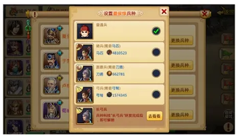 3、之后我们就可以在队伍里面给各个武将进行更换兵种,不过前提是材料得足够,比如主公想改为弓兵的话,如果主公的战力是60万,那么就要消耗60支弓箭,后续补兵时同样需要消耗兵数相应的弓箭。兵种间也有相互克制的关系,因此一个队伍里最好有不同的兵种哦。