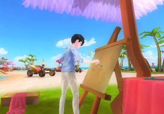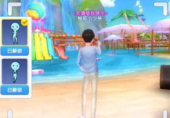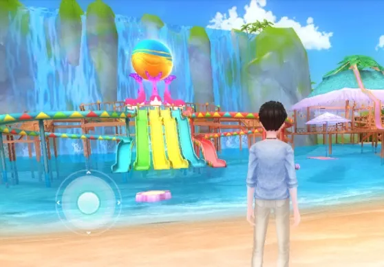 休闲区内采用的是轮盘来控制方向,右侧多了一个跳跃和单人动作按钮。跳跃可以帮助你轻松跃上平台,而点击单人动作按钮,便会做出相应的表情动作,在沙滩上尽情地凹造型吧!