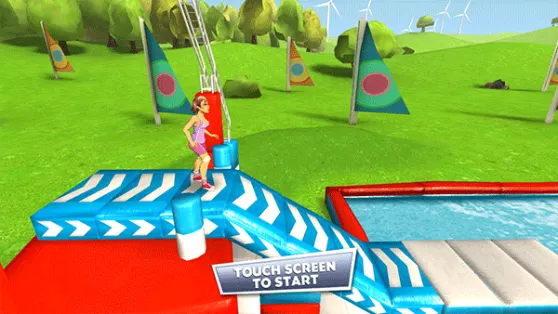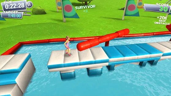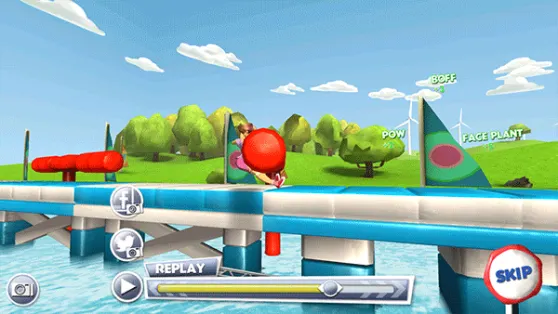 在这个过程中,移动平台、大摆锤、风车障碍、弹跳球等诸多道具和陷阱都需要你避开,因此玩家必须时刻保持警惕,否则稍有不慎就会落入水中,不得不重新开始。此外,角色失败落水等场景还会以慢动作回放,滑稽的动作搭配诙谐的尖叫声,常常令人捧腹大笑,游戏体验相当有趣。