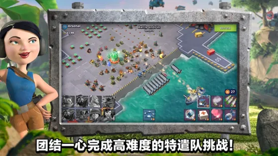《海岛奇兵》从沙滩指定范围内登陆.然后在海面上有战舰提供导弹、医疗支援,同时还能释放引导弹进行实时打击目标指挥。至于坐着登陆艇成功冲上岸的士兵,全自动战斗,会优先攻击最近的建筑,这时就需要你引导他们集中火力,打掉敌方防御工事先。最后,只要摧毁敌人的司令部就能引爆敌人整个基地,获得胜利,拿到战利品。