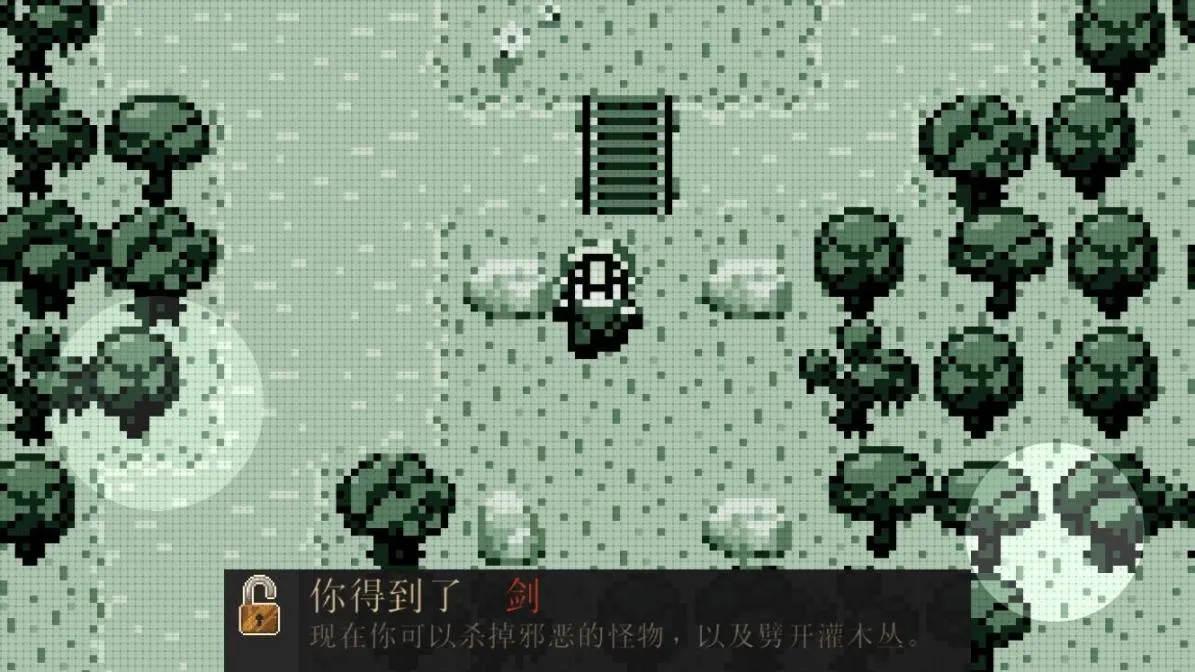 在我们没有武器的时候路上的灌木丛会挡住我们的去路,有武器的时候只需要点击攻击就可以击毁灌木丛,在击毁灌木丛后有几率掉落补血的红心和金币。在屏幕的左上角绿色条是我们的生命值,底下的黄色条是经验值,击杀怪物后可以获得大量经验升级。在森林中如果遇到宝箱的话一定要面对宝箱点击攻击键可以打开宝箱获得物品。在游戏中看到蓝色的光圈时一定要在上面站一下因为这是保存记录的,每当玩家战败后都可以再上一个地方复活。
