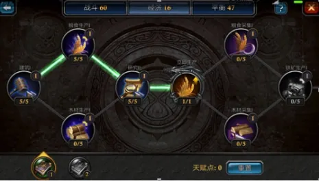 平衡天赋的加点,平衡天赋在发展过程中起着很大作用,因为它在发育时对各个建筑的属性加成包括医院容量、训练速度和其他很多地方都有加速和提升。这个加点也建议全部往后面加。加点稍微复杂的就是战斗天赋的加成,另外一点大家记得注意使用天赋技能,比如使用立即生产立马从城里田中收取五小时采集量,使用三秒回兵坑打你的人这些都是很实用的技能。