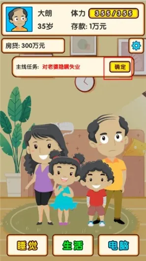 1、打开失业模拟器游戏,进入游戏首页,点击确定,进入主线任务;