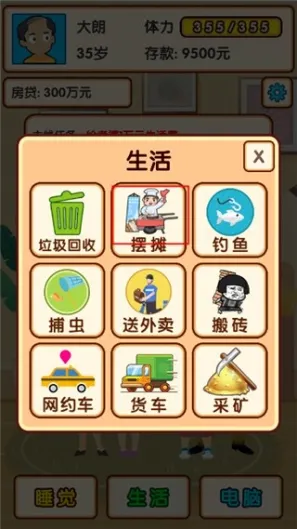 4、之后的主线是要给老婆一万块钱,我们点击生活,选择摆摊;
