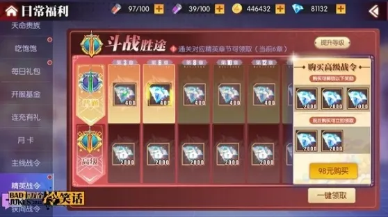 所谓精英,就是要快人一步!98元的精英战令,通关完22章累计获得免费的4000钻石+额外领取20000钻石,挑战关卡,证明自己,成就感和回报都相当丰厚!