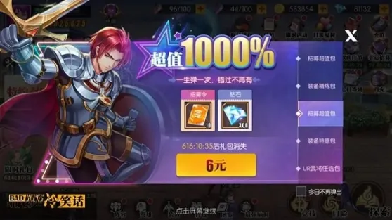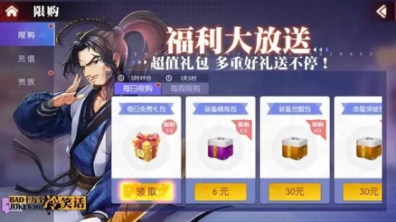 十万个冷笑话2022每日限购礼包提供了一定折扣优惠的招募令以及装备、命星等基础养成材料,快速提升战力;周限购礼包内则主要提供装备、命星的觉醒突破材料,以及SSR英雄的专属装备用于升星。