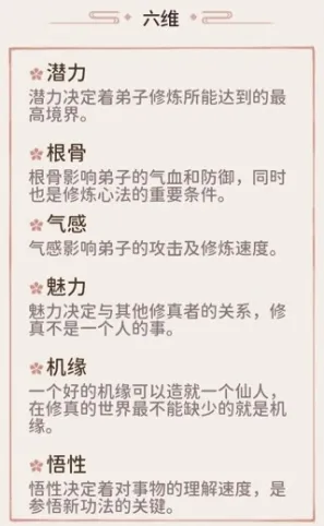 历练需要招收四个重点培养的六边形战士。在元婴前最为重要的属性是:根骨和气感。