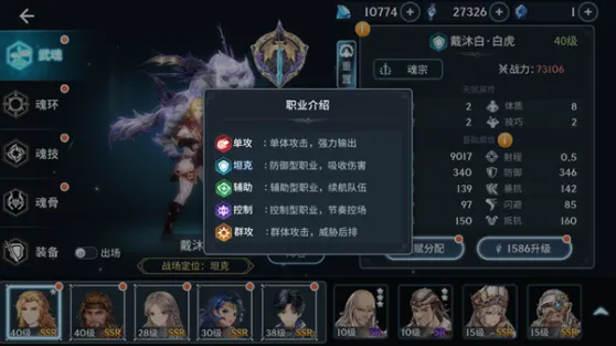 在游戏中,一共有五个不同的职业,分别是单攻,坦克,辅助,控制,群攻。