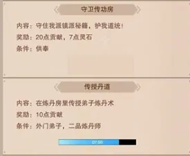 5、任务大厅:做任务,从而获取宗门贡献(游戏货币之一),满足相应任务要求,可做相应的任务,获取贡献。升级需要 可做任务。