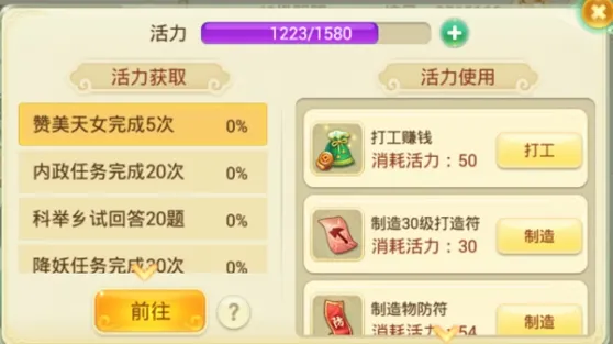 活力:玩家从事某些生产、制作等活动时,需要消耗一定的活力;在日常游戏过程中获得活跃度后可自动恢复对应点数的活力。