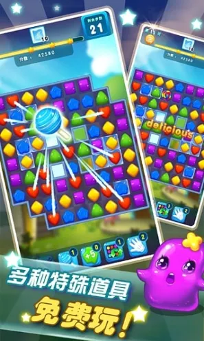 虽然游戏名为消灭星星2,但其玩法与前作差异明显,更接近糖果粉碎传奇。通过手指滑动交换相邻图案,消除三个或更多相同的图案,以获取高分。