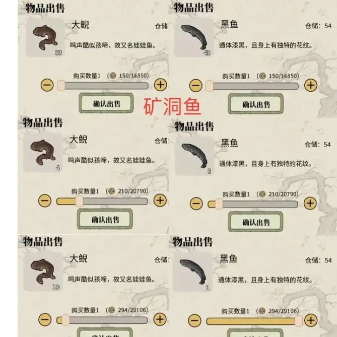 (1)鱼饵最低22,矿洞钓鱼来钱最快就是费时间,实测矿洞第1层和第26层钓鱼无区别,大鲵和黑鱼价格相同。
