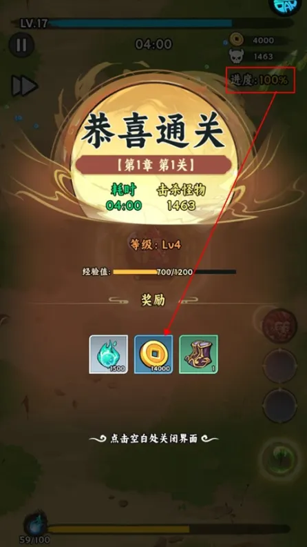 当玩家将最终boss击败时就达到100%进度并获得胜利啦,点击任意位置即可领取奖励并退出关卡。