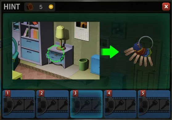 第一关:打开抽屉,得到里面的七把钥匙。