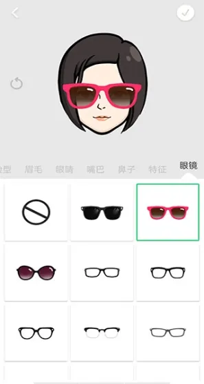 进入编辑面板后,用户可以自定义个人形象,软件提供前发、后发、发色、肤色、脸型、眉毛、眼睛、嘴巴、鼻子、特征、胡子和眼镜等元素供用户免费使用。完成编辑后,点击右上角的“√”即可保存图片。