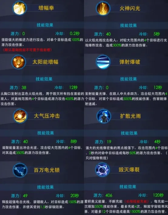 攻击类技能有“增幅拳”“火神闪光”“太阳能增幅”“弹射爆破”“大气压冲击”“扩散光雨”“百万电光锁”“毁灭爆裂”。这些技能大多数都是aoe技能,用起来爽到飞起,真的是high到不行啊。