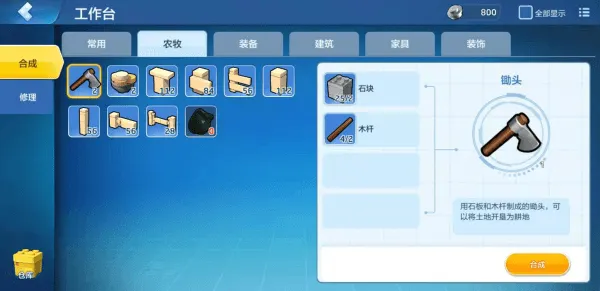 顺手做把锄头,锄头可以用来锄地。这里有个小技巧,右手点击锄地的目标地块,然后手指往左开始移动,你会发现很长一块耕地就犁好了!不过前提是要多多练习。