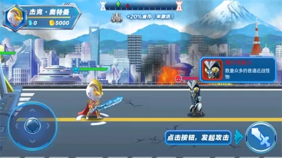 4、玩家需要通过按住并滑动左下角的按钮来控制奥特曼移动;