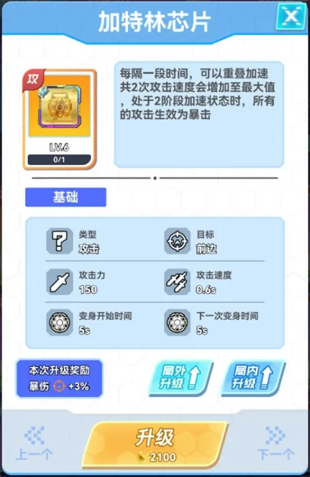 (2)芯片升级后,你会获得永久的暴击属性加成,是对所有芯片生效的哦!所以千万别忘了升级!