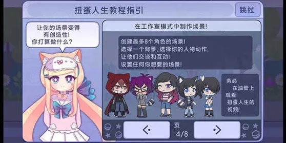 4、在工作室模式中制作场景!创建最多8个角色的场景!选择一个背景,选择你的人物动作,让他们交谈和互动!设置任何你想要的场景!务必观看扭蛋人生的视频!
