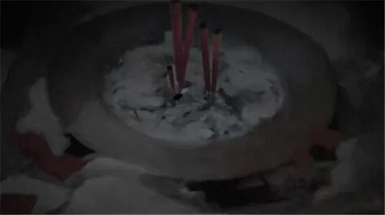 4、在石碑处向左走,即可重新发现神庙,将【点燃的香】插入火盆中。