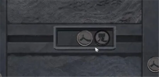 18、点击石柱右方的建筑,根据图案提示,点击中央的按钮来调整图案,黄色石柱处的正确图案为下图所示。