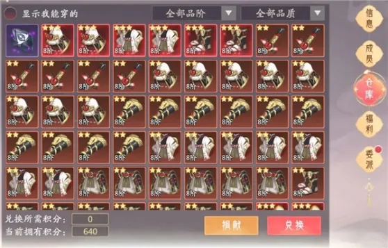 帮派仓库是妖主获取初期装备的重要来源。帮派里的大佬们可以将用不到的装备捐献到帮派仓库中,其他妖主可以使用仓库积分进行兑换。