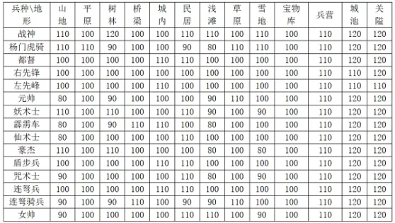 地形适应力为各个兵种在对应地形上能够发挥的属性值。