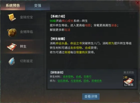 (2)90阶段当我们通过练功房或者打怪升到90级时将会正式开启我们的转生系统,转生需要消耗转生材料,分别为命运水晶与命运之书。