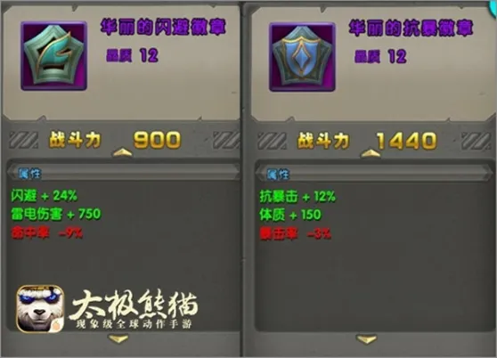 太极熊猫中所有的时装都将开放镶嵌徽章的功能,而不同的徽章可以带来不同的属性加成,玩家将会得到生命、伤害、免伤、命中、闪避、暴击、抗暴、暴伤、暴免等主要属性,但需要注意的是在得到徽章的主属性的同时,还将得到两个副属性。其中一个副属性有力量、敏捷、残暴等正面加成,但另一个副属性会有对应主属性类的负值加载。