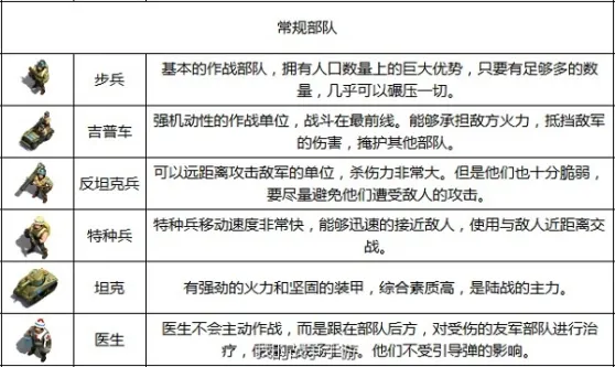 5、坦克:有强劲的火力和坚固的装甲,综合素质高,是陆战的主力。