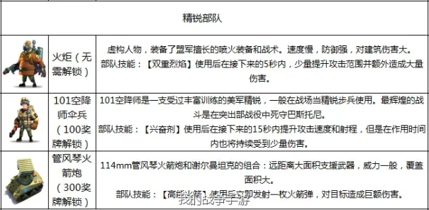 1、火炬(无需解锁):虚构人物,装备了盟军擅长的喷火装备和战术。速度慢,防御强,对建筑伤害大。