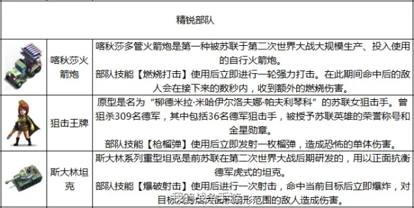 部队技能:【穿甲射击】使用后立即发射一枚炮弹,穿透当前目标,对其身后直线范围内敌人造成伤害。
