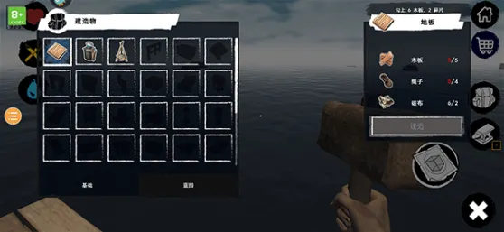 最初资源有限,需要利用钩爪获取资源,有时候还能看到各种小岛屿,利用船锚使木筏停下来,建造一把斧头可以上去采集更多的资源,后期实力强大起来,可以通过安装捕网道具在海面上能更被动化的获取资源。