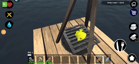 1.在游戏的开局阶段,你需要使用钩子收集资源。请注意,不要错过任何木桶,如果无法钩住,你可以下水捞取。首先,你需要建造杯子和煮水器,然后是炉子和鱼竿。这些设施将帮助你生存和烹饪食物。