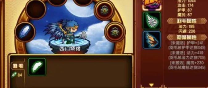 5、穿戴后可以点击下方的羽毛,选择装备,将羽毛装备到翅膀上,并且获得额外的羽毛属性加成。再次点击羽毛可以选择卸下。