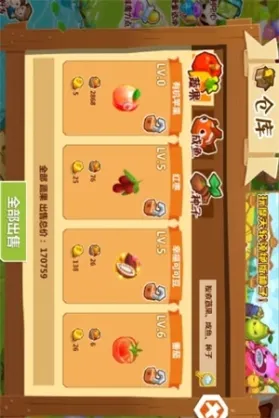 7、点击仓库管理,最后在新的窗口里,选中第一个果实,这里就可以看见刚才偷取好友的菜和果实了,点击下方可以卖出换钱