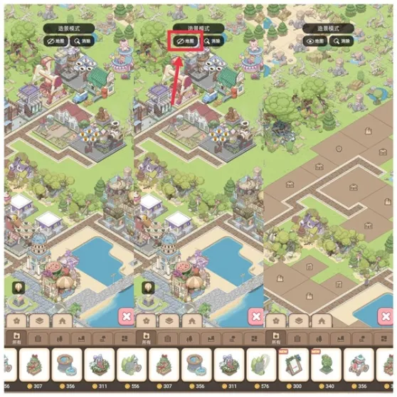 点击右下角安全帽进入造景模式后,点击右上角地图进入地基模式,地基模式下只显示建筑占用的格子