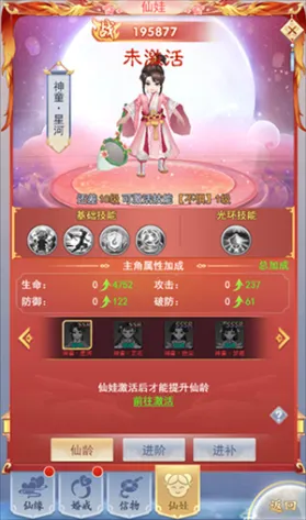 仙娃除了获得技能上的效果加成之外,还可通过进补的方式获得提升属性。