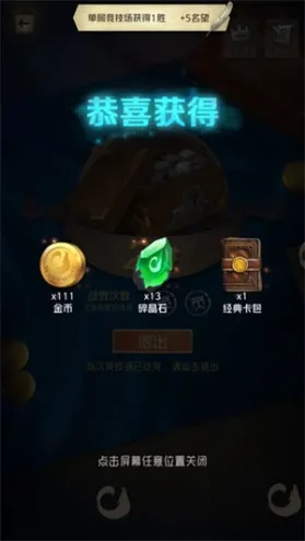 竞技场的门票可不便宜,1000大洋的门票让很多苦攒金币准备换卡包的玩家望而却步。其实竞技场才是快速获得卡包的最快方式。只要胜利两局,我们不但可以轻松入手一个经典卡包,而且还可以获得卡牌合成道具碎晶石以及金币奖励。