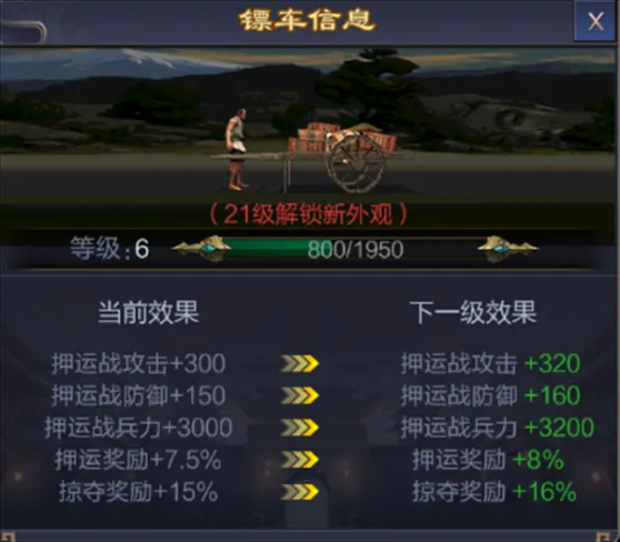 押运获得的镖车经验可以提升镖车等级,镖车升级可以增加属性和奖励,达到指定等级可以解锁新外观。