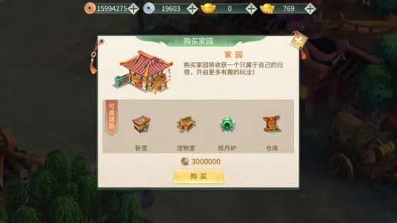 家园中共有卧室、宠物室、炼丹炉和仓库四种功能玩法。