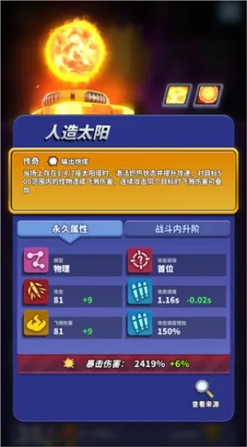 人造太阳拥有非常强力的溅射伤害并且伤害可以叠加,当防御塔数量达到 1|4|7 时便可激活溅射和增加攻速,配合反应堆的加持 BUFF 和重构的增伤 BUFF,输出能力非常强。